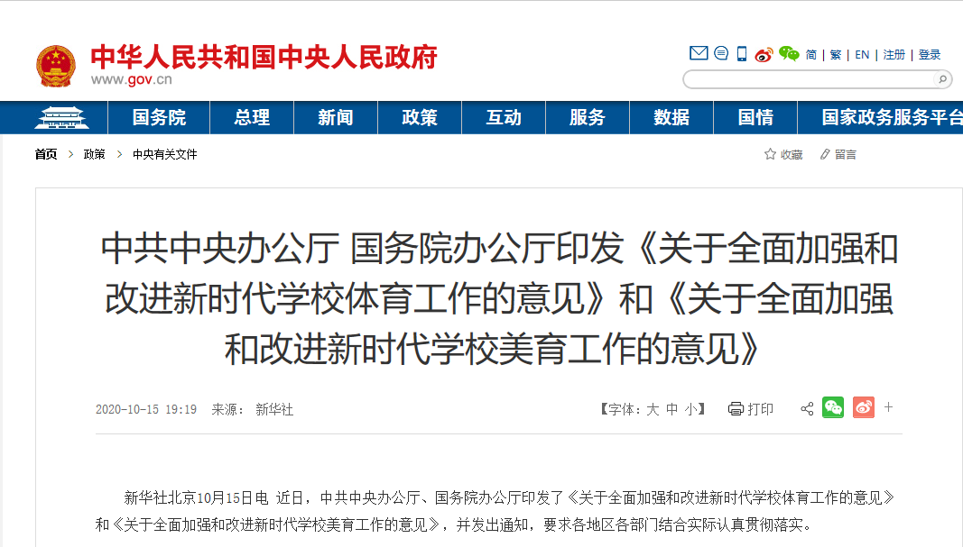 近日,中共中央办公厅、国务院办公厅印发了《关于全面加强和改进新时代学校体育工作的意见》和《关于全面加强和改进新时代学校美育工作的意见》,就全面贯彻党的教育方针,加强和改进新时代学校体育、美育工作进行了系统设计和全面部署;并发出通知要求各地区部门结合实际认真贯彻落实。其中,《关于全面加强和改进新时代学校体育工作的意见》全文可点击文末“阅读原文”查看。