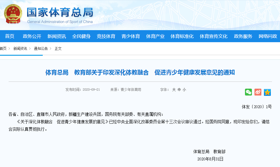 事实上,这已经不是新学期以来第一回听到关于中考体育的新动向了。9月21日,国家体育总局刚发布过的一则通知:《体育总局 教育部关于印发深化体教融合 促进青少年健康发展意见的通知》中就提到,“要加强学校体育工作,将体育科目纳入初、高中学业水平考试范围,纳入中考计分科目,科学确定并逐步提高分值,启动体育素养在高校招生中的使用研究。”